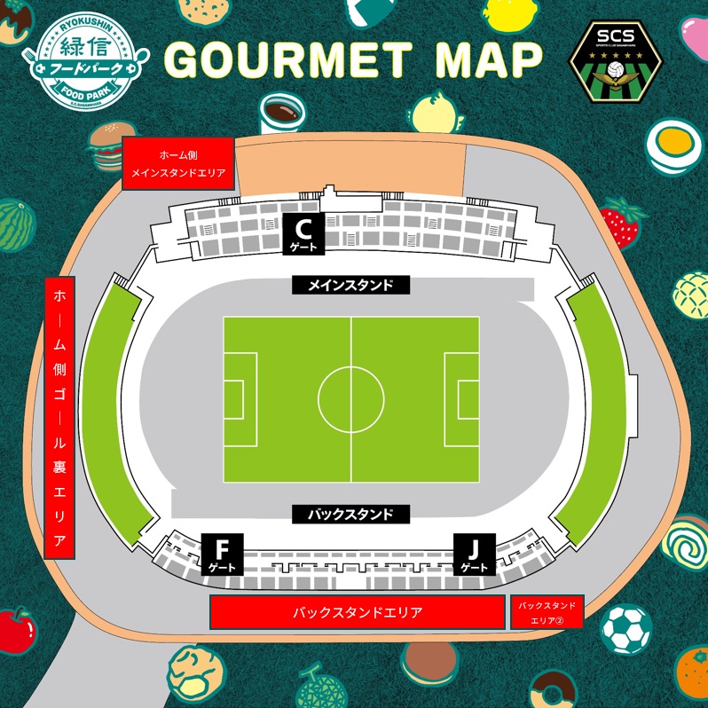 SC相模原公式サイトのトップページ → ホームゲーム情報 → 確認したいホームゲームの「ホームゲーム情報」 → 「緑信フードパーク」内の「緑信フードパーク 出店店舗」