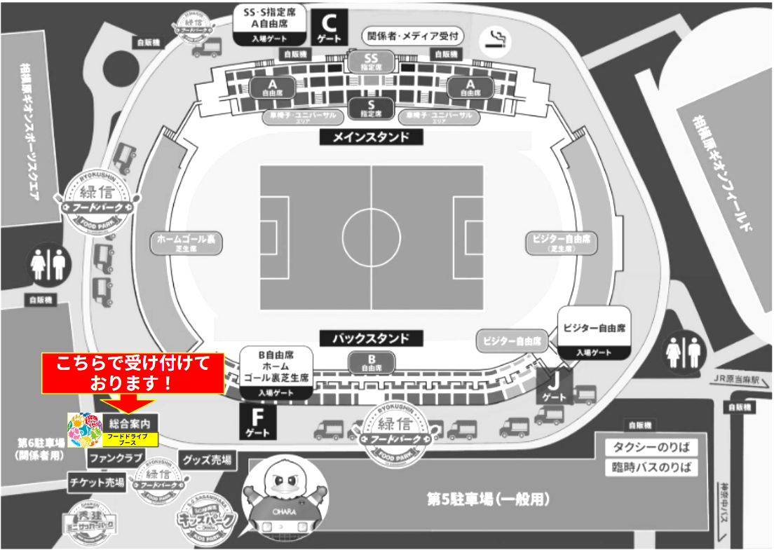 スタジアム園路「SC相模原フードドライブブース」(総合案内の近く)でお受付します。